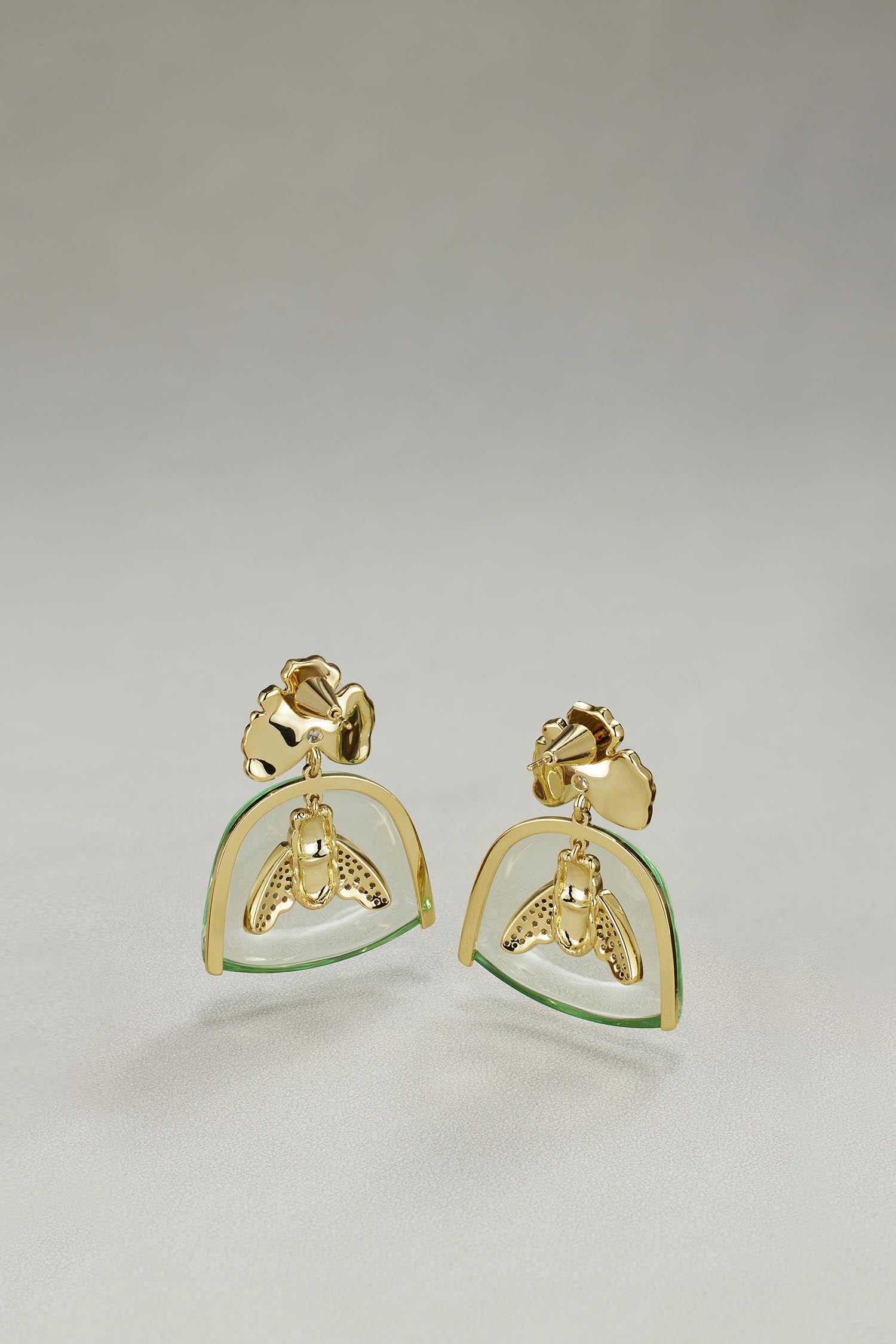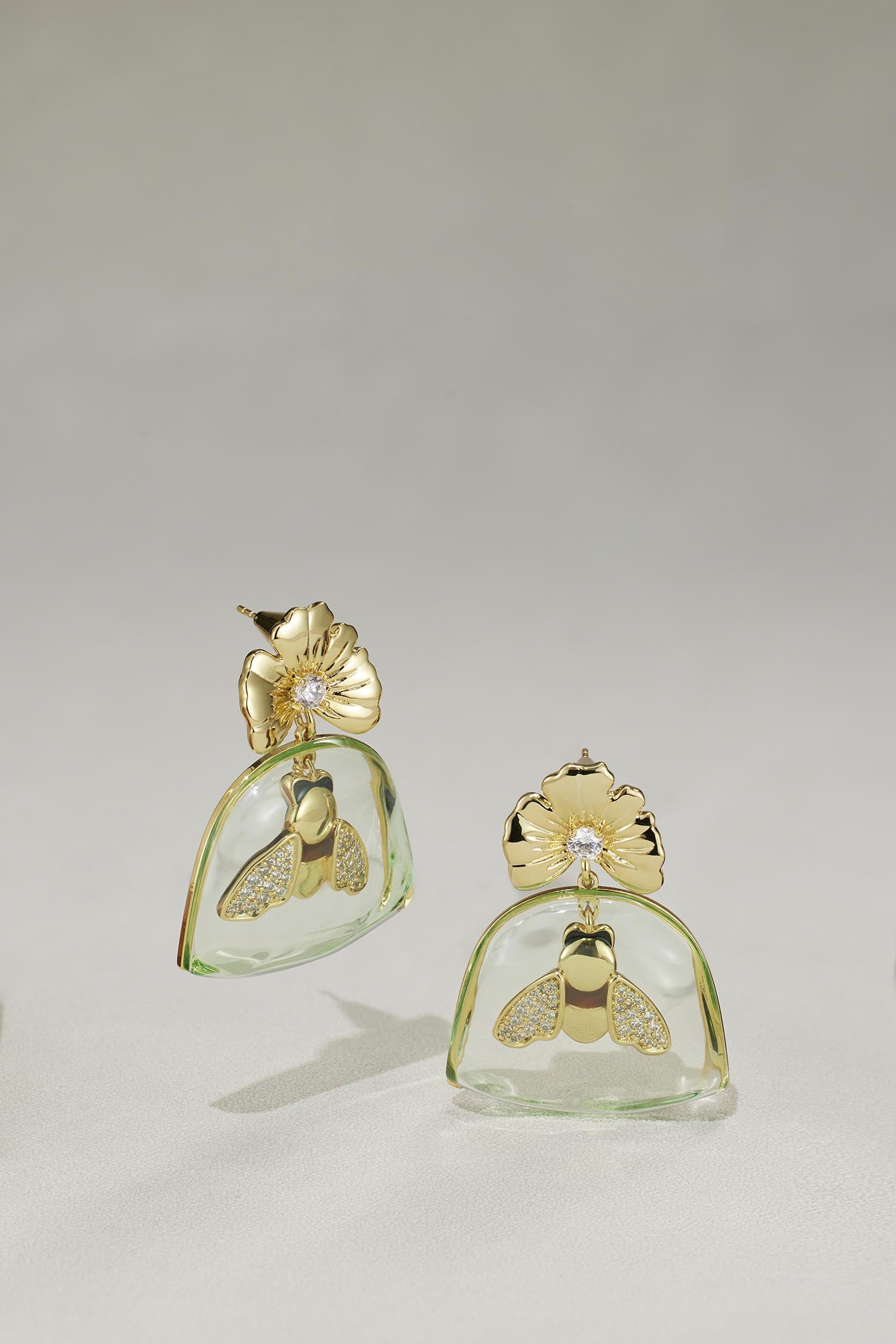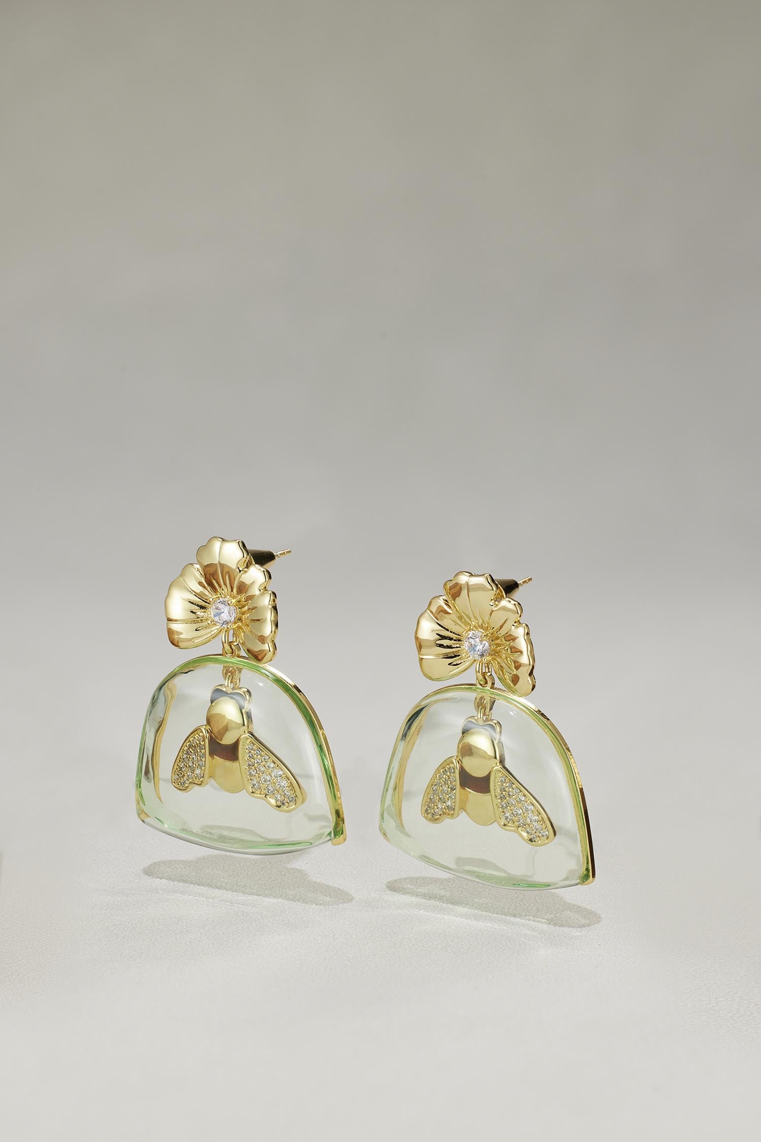 Made of premium lucite amber with 14K gold polished bees inside and decorated with zircon.